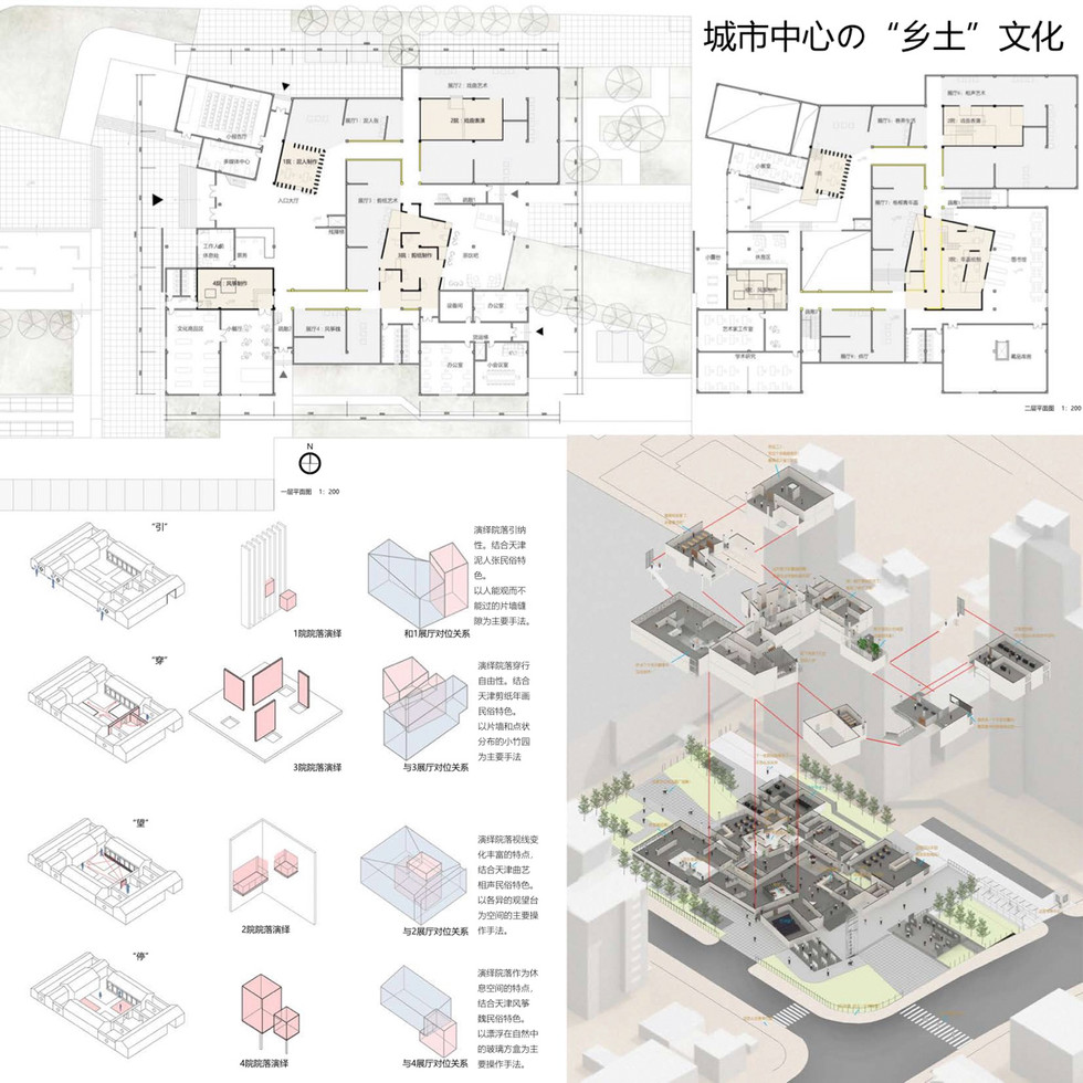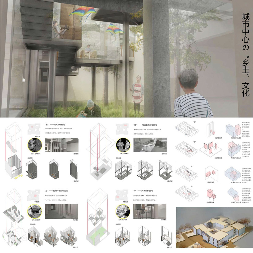 Local architecture does not necessarily exist only in rural areas. In the city, it can still attract more attention with its unique architectural style. It seems to be incompatible with the rapid development of modern high-rise buildings. However, it infects the surrounding with a more intense contrast.The use of concrete as a material theme introduces the spatial patterns of traditional communities and modernizes them. The inward courtyard in the original community was transformed into an open yard in the community, and it was turned into a production experience space for folk craftsmanship. In the courtyard where the “community” is embedded, there is a zero-distance experience of the folk, so that the folk can be re-engaged.