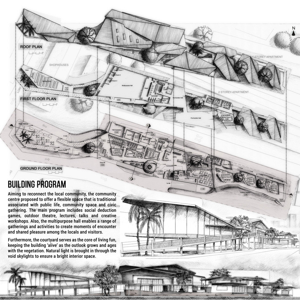 KABA community centre is a project aiming to upend the typical associations of vernacular architecture. Situated at Kampung Banda Kaba, Melaka, the project requires the ability of the designer to understand issues of heritage and social in a historical urban context. In order to generate a dialogue between the local community and foreign visitors, the design scheme integrates amenities within the compact space to influence a more comfortable neighbourhood.