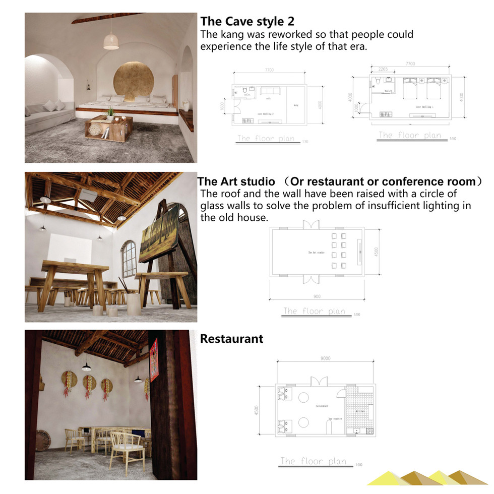Most of the existing houses in Shanyuan village are adobe and rammed earth houses built in the early days of the founding of the People's Republic of China,More is the abandoned state of the cliff of the adobe cave.Although the cave has the advantage of warm winter and cool summer, the problem of moisture-proof and ventilating needs to be solved in the new design.The mountain courtyard village has the beautiful scenery, the old building reconstruction, can be the student art writing base, also can be the home stay, receives the visitor.The interior space of the new building is still in the form of a cave, exposing some of the earth walls, and reproducing the kang so that people can experience the life style of that era.In design language, the past and future are expressed through the interweave of different materials.Again use of local materials in the design of, let it not only become a kind of adornment, but also a cultural symbol, under the new situation of local material use gives the soul of the new building, becomes sustainable.