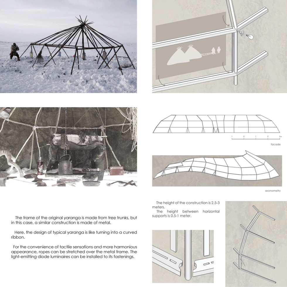 The majority of modern Chukchi live in ordinary concrete houses. I think that this only means that yaranga must be reconsidered. My project represents a fresh look at this ancient dwelling. In my project it is a family and tribal cultural center. People can come here and just enjoy communication; elderly people can share their life experience for those who gathered around to listen.